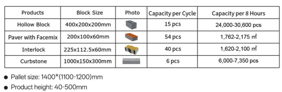 ZN1500-2 stacionarni stroj za enopaletne bloke predstavlja najnovejšo generacijo opreme za inteligentne stroje za opeko, razvite z nemško tehnologijo Zenith. Kot visoko zmogljiv stroj za negorečo opeko je zasnovan za izdelavo celotnega obsega standardnih betonskih izdelkov, vključno z betonskimi bloki, votlimi bloki, tlakovci in drugimi konstrukcijskimi gradbenimi materiali.